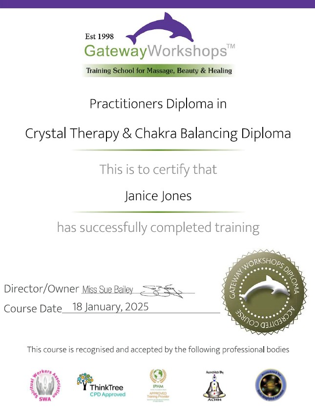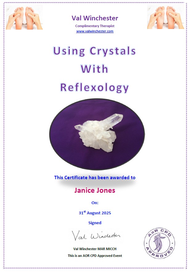 In January 2025, I received qualifications - Introduction to Crystal Therapy & Crystal Therapy/Chakra Balancing. In August 2025, Using Crystals with Reflexology in December 2025, Using Crystals with Reflexology Advanced Course. Case studies were undertaken concluding in positive results for all my clients.