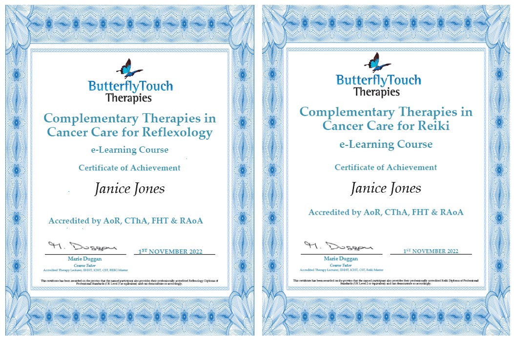 In 2022 I gained Level 2 Certificates for Complimentary Therapies in Cancer Care for Reiki and Reflexology. I have learnt how to work with the client to be adaptable and flexible while providing a gentle and shorter therapy. Cancer diagnosis can bring on physical, emotional and mental challenges. Reiki and Reflexology can help with side effects like pain, anxiety and sickness that cancer treatment can cause. These therapies can promote relaxation helping people feel better in their overall wellbeing. People starting,undergoing or just finishing Chemotherapy, Radiotherapy or Hormone Therapy will need permission from their Oncologist Consultant (team) before receiving a treatment to make sure there is no objection to the therapy.